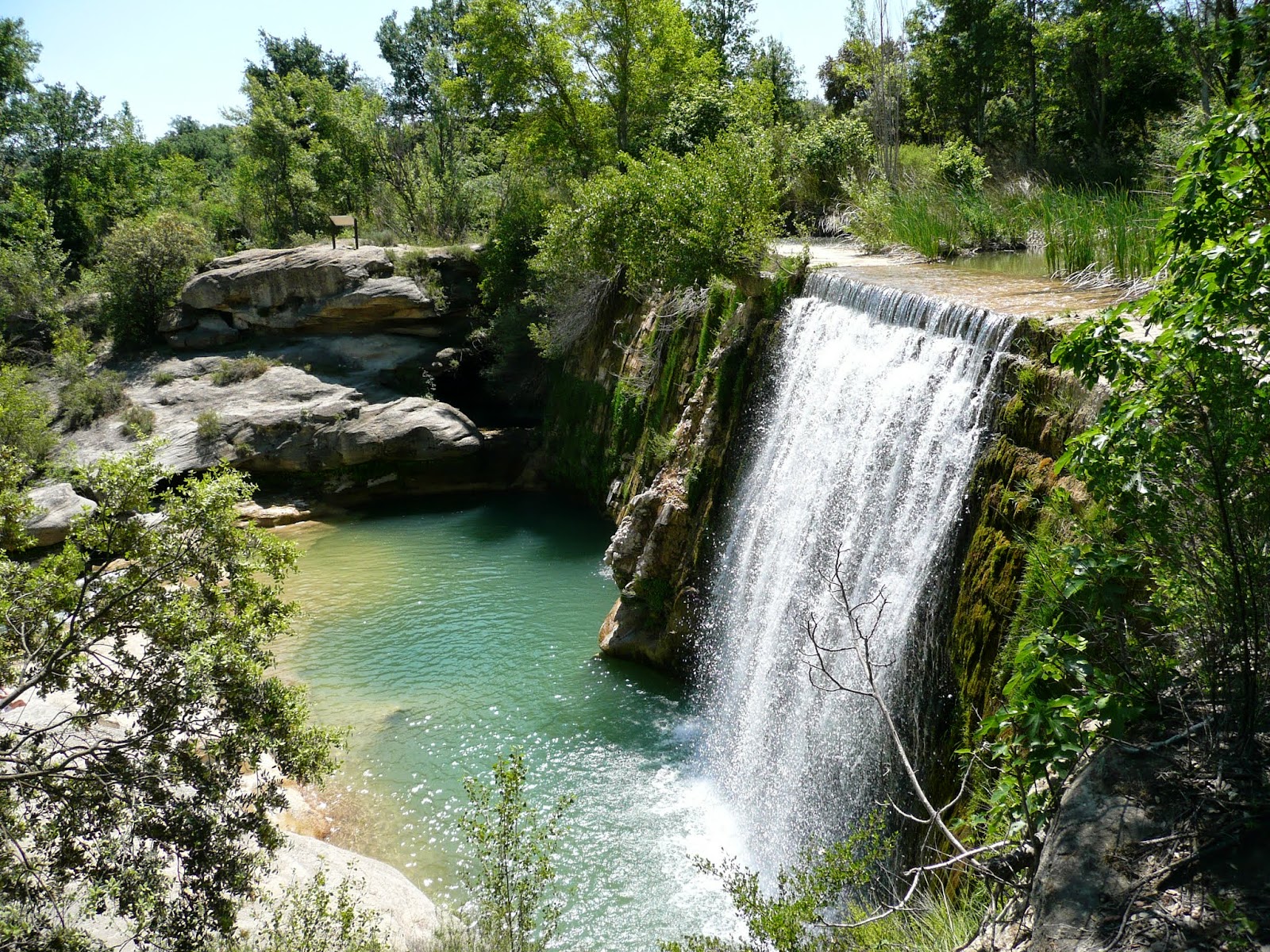 Supongo que lo suyo sería destrepar por aquí hasta el cauce, pero nosotros cruzamos por encima de la presa. No bajaba mucho agua, y con las botas ni nos mojamos, pero es un poco peligroso. Ya en la otra orilla también tuvimos un pequeño destrepe, donde Isabel se quedó un poco atrancada, pero no fue nada. Allí mismo había una hermosa sombra donde nos acomodamos para comer. Parecía un día de julio, no por la gente sino por el calor, que era agobiante.